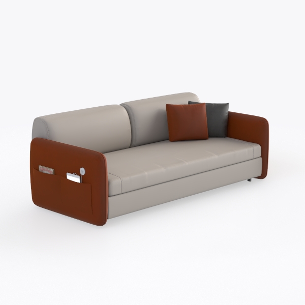 Introducing an innovative seating option that beautifully merges contemporary style with comfort, this sofa is a testament to modern design principles. Inspired by minimalist aesthetics, its soft, cream upholstery offers a luxurious touch, while the vibrant orange armrests add a striking pop of color, effortlessly drawing attention. The visual appeal is enhanced with carefully placed throw pillows in shades of burnt orange and charcoal, creating a delightful contrast that invites relaxation.