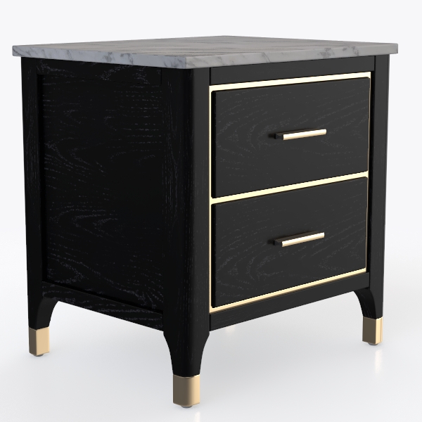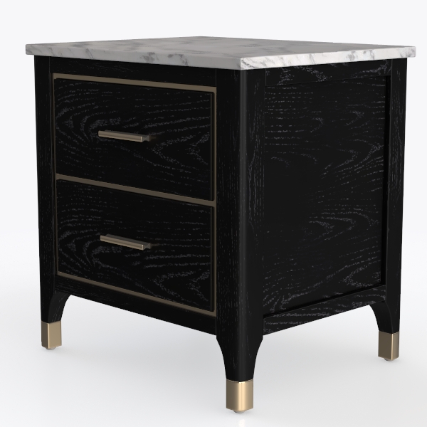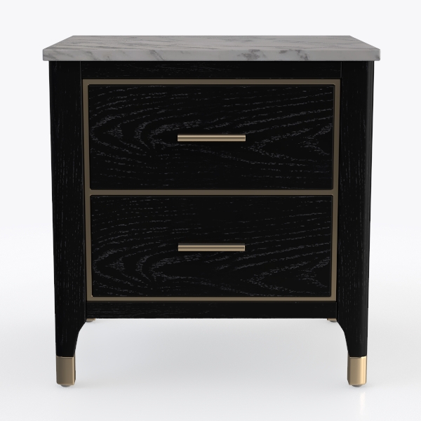 This nightstand embodies a thoughtful fusion of timeless elegance and modern simplicity, drawing inspiration from the interplay of classic design principles and contemporary aesthetics. Its frame features a rich, matte black wood grain, its surface smooth yet subtly textured, revealing the natural patterns of the wood under soft light, while the top is adorned with a polished marble slab—veined in soft grays and whites, offering a cool, sleek contrast to the warm wood tones.