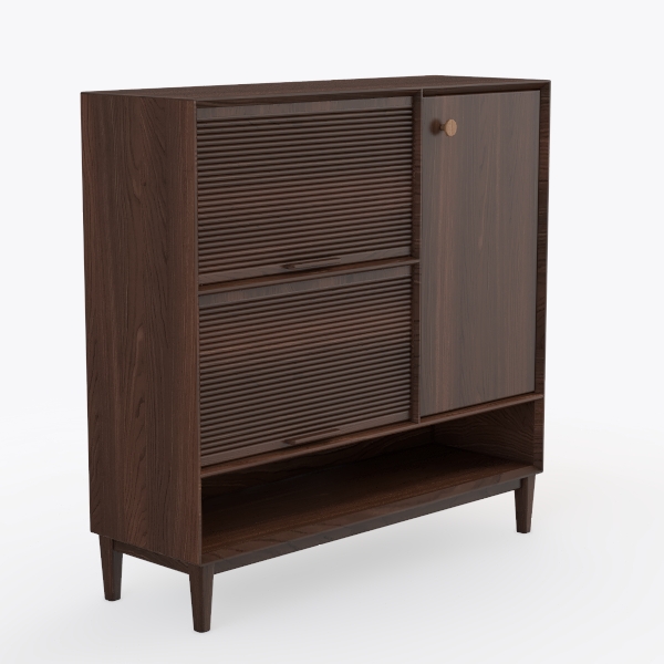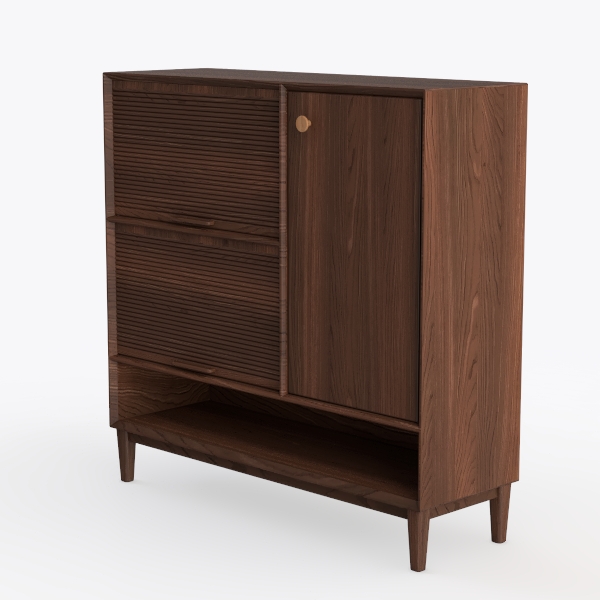This cabinet thrives in spaces that blend modern minimalism with cozy, lived-in charm. In a minimalist living room, it anchors the area when paired with a light, neutral sofa and a low-profile coffee table, its vertical slatted drawers and rectangular door creating a satisfying rhythm against the room’s open layout. In a home office, it serves as a stylish storage solution, complementing sleek desks and houseplants to soften the workspace’s sharp edges.