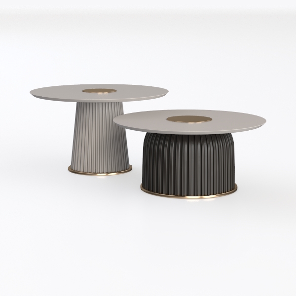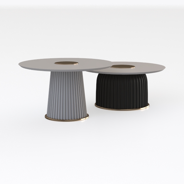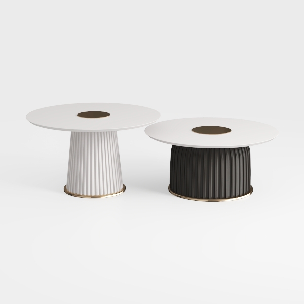 These two elegant side tables embody a blend of architectural minimalism and modern sophistication, inspired by the clean lines and structural harmony found in contemporary design. The white table features a smooth, glossy top with a subtle circular center indentation, while the black counterpart offers a matte finish, creating a striking yet balanced contrast. Both bases showcase vertical ribbed detailing—rendered in a tactile, slightly textured material—that adds visual interest without overwhelming the eye, catching light gently to enhance their sculptural presence. A thin gold rim along the base edges elevates the design with a touch of luxury, softening the simplicity and grounding the tables in refined charm.