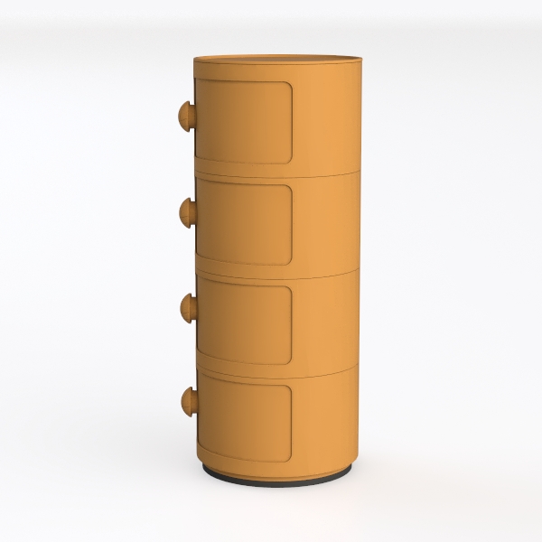 Crafted with organic curves and mid-century modern charm, this cylindrical cabinet draws inspiration from nature’s soft lines and the clean minimalism of 1950s design, balancing warmth and simplicity. Its warm amber hue, achieved through a smooth, matte finish, catches light gently, creating subtle shadows that enhance its rounded silhouette. The wooden texture, visible in fine, natural grain details, adds a tactile richness—cool to the touch yet inviting, making it a pleasure to run a hand over its surface.