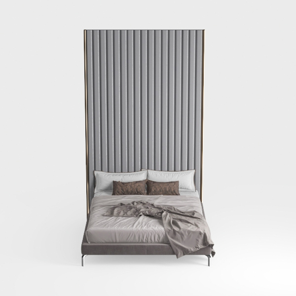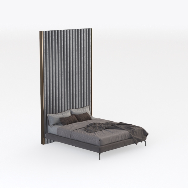 This bed merges organic minimalism with subtle luxury, inspired by the rhythmic vertical lines of natural elements—think tall grass or sleek shutters—translated into a contemporary form. The headboard stands out with its soft, vertical ribbed texture, crafted from a plush, neutral-gray fabric that feels gentle to the touch. Its fine, consistent ridges create a calming visual rhythm, while the warm gray hue infuses the space with a serene, grounding energy. Golden metal trim along the headboard’s edges adds a touch of refined elegance, balancing the softness with a hint of sophistication, making it a focal point that feels both intentional and approachable.