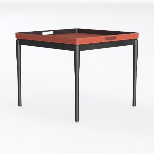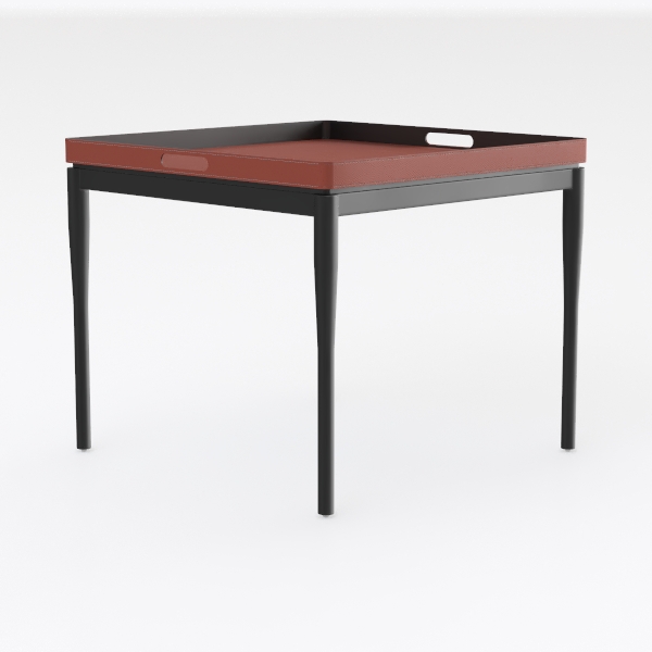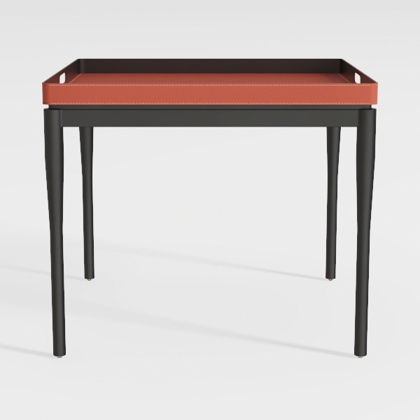 This elegant piece draws inspiration from the balance of minimalism and tactile artistry, merging soft, natural elements with sharp, architectural precision. The table features a striking contrast between its smooth, warm terracotta leather top—with delicate topstitching adding subtle texture—and the sleek, matte black metal frame, where slender, tapering legs rise to cradle the elevated surface. Visually, it exudes a modern, understated allure: the rich terracotta hue softens the cool black base, creating a focal point that feels both grounded and sophisticated, with clean lines that enhance any space’s openness.