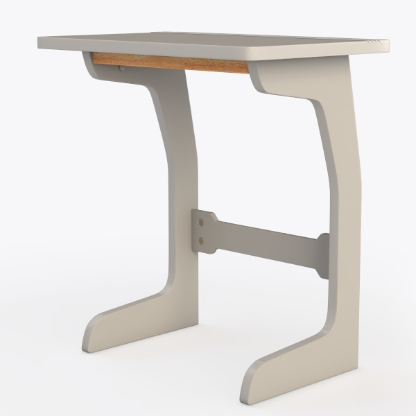 Crafted with a harmonious blend of industrial and organic aesthetics, this piece draws inspiration from the timeless interplay of natural materials and structured design. The tabletop features a smooth, matte gray surface with a subtle sheen, its cool, neutral tone creating a calm foundation. Beneath, a solid wood underframe reveals rich, natural grain patterns in warm oak, adding a tactile, earthy contrast that softens the overall look. The metal legs, with their angular, tapering profile and matte silver finish, offer robust support while maintaining a lightweight, airy presence, their geometric lines balancing the organic warmth of the wood.