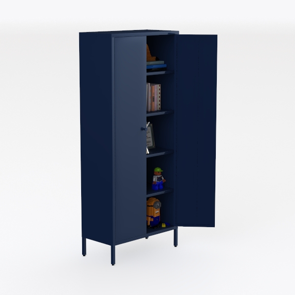 The deep, rich navy finish features a smooth, matte surface that feels cool yet tactile to the touch—subtly velvety, not cold, with a soft sheen that catches light gently, avoiding harsh glare for a calm, sophisticated vibe. Clean, straight lines define its structure: symmetric double doors that open wide to reveal four thoughtfully spaced shelves, creating a balanced rhythm between open display and closed storage. The cabinet’s silhouette is elevated by slender, tapered legs, which keep it light and airy, avoiding the bulk that can weigh down smaller rooms.