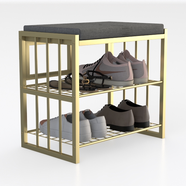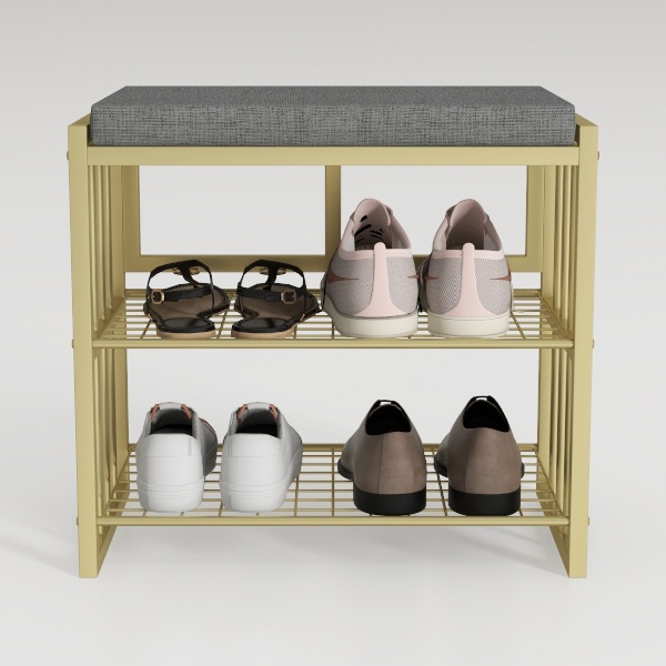 Functionality shines here: the padded top serves as a convenient spot to sit while changing shoes, its soft fabric providing comfort, while the two tiers of open shelves efficiently store sandals, sneakers, or ankle boots. The metal grid design ensures shoes stay visible and well-ventilated, keeping the space fresh, while the sturdy frame guarantees durability. This blend of form and function makes it a versatile, eye-catching addition to any home.