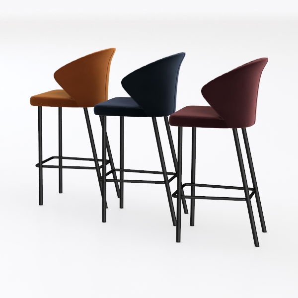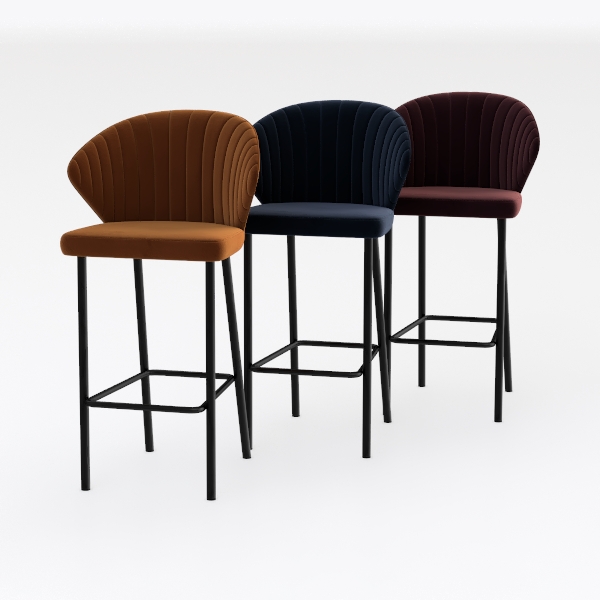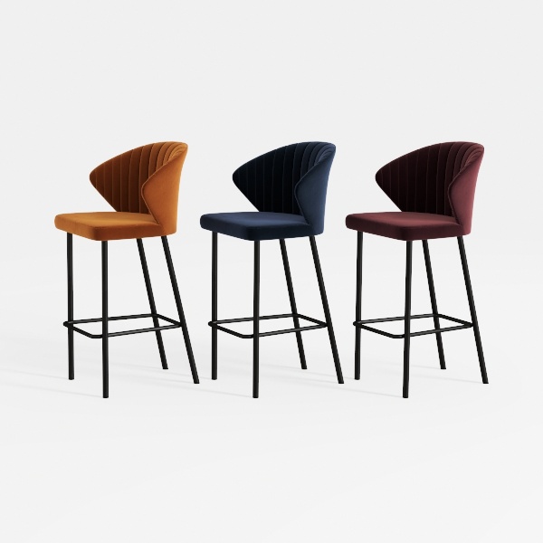 Inspired by mid-century modern design, these bar stools blend timeless elegance with contemporary flair. The curved backrest, detailed with soft vertical channels, creates a graceful silhouette that feels both nostalgic and fresh. Crafted with plush, velvety upholstery in rich, warm hues—rust orange, deep navy, and burgundy—they offer a tactile experience that’s both inviting and luxurious, their soft texture promising comfort even during extended seating. The matte black metal legs, slender yet sturdy, contrast beautifully with the opulent fabric, adding a touch of industrial edge to the overall look.