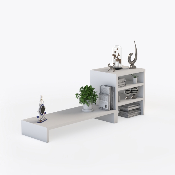 This piece of furniture merges minimalist aesthetics with practical living, taking cues from the balance between structured storage and organic warmth. Its sleek, unadorned form—with a long, flat base and staggered upper shelves—creates a visually cohesive design that feels both intentional and uncluttered. The smooth, matte white surface reflects light gently, casting a bright, airy glow, while the varied heights of the shelves add subtle dimension, making it a focal point without overwhelming the space.
