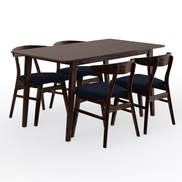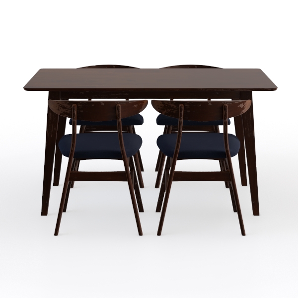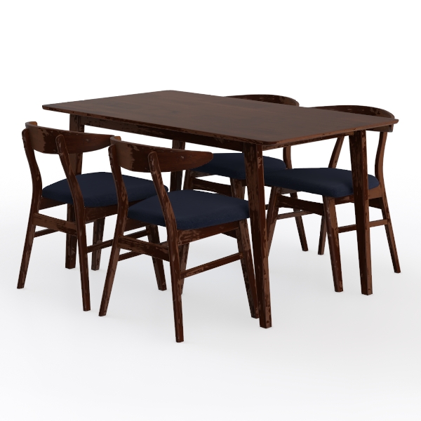 The four accompanying chairs echo this simplicity: their dark wood frames follow the same geometric precision, with gently curved backs that cradle the spine, and plush navy upholstered seats that offer a satisfyingly soft, resilient feel. The fabric of the cushions is smooth yet durable, inviting extended periods of sitting without sacrificing comfort. Visually, the set exudes calm cohesion—deep wood tones paired with the muted blue of the seats create a timeless palette, while the lack of fussy details keeps the focus on the interplay of texture and form.