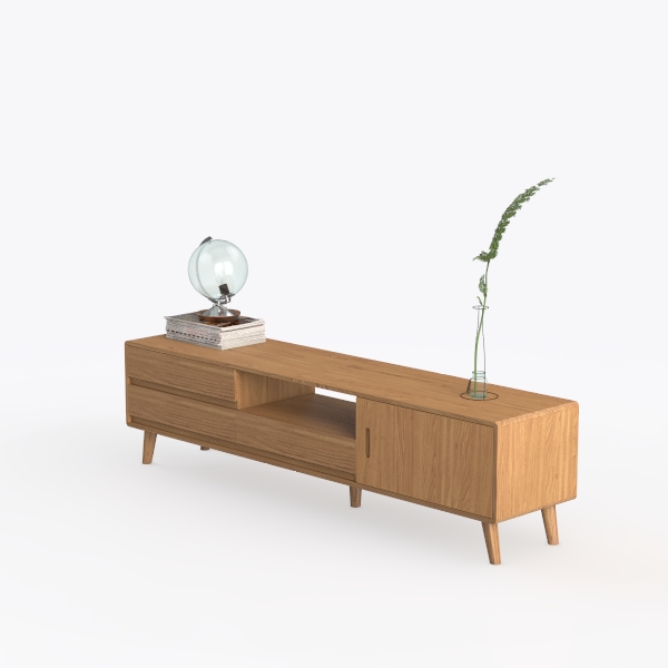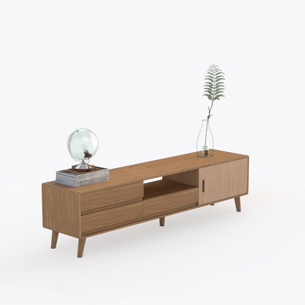 Crafted with nature-inspired minimalism, this wooden console features a warm, tactile oak-like surface with subtle grain patterns for visual depth. Clean lines and soft edges create a serene, unobtrusive look, perfect for modern living rooms. Pair with potted ferns, vintage globes, and metal accents. Spacious drawers and an open shelf offer ample storage, merging style and functionality seamlessly.