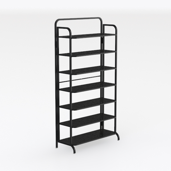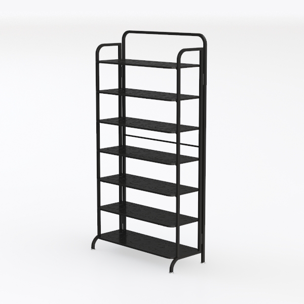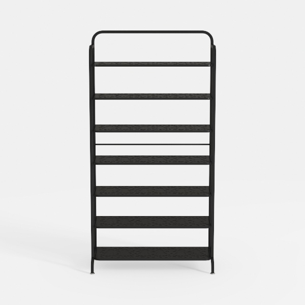 Inspired by industrial minimalism, this sleek shelf boasts clean lines and a matte black finish. Its metal frame feels cool and sturdy, while textured shelves add subtle depth. Perfect for modern living rooms or studies, pair with wooden accents and metallic lamps. Multiple tiers offer ample storage; stable base ensures durability, saving floor space neatly.