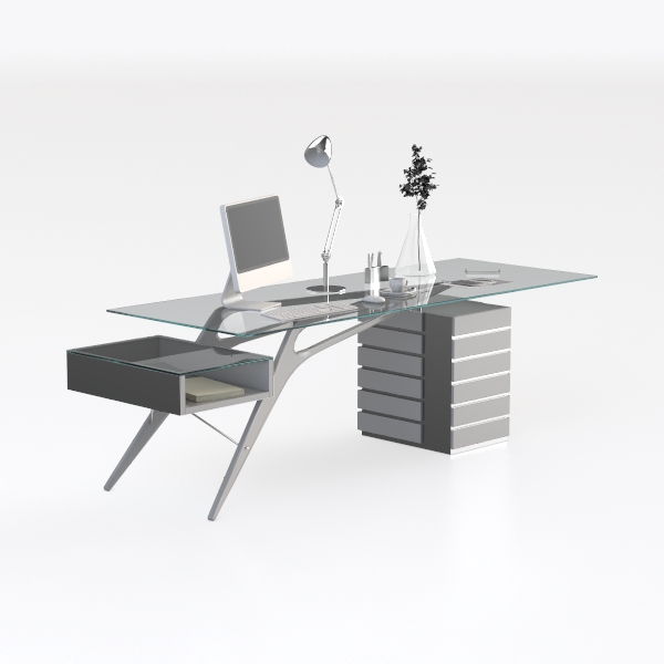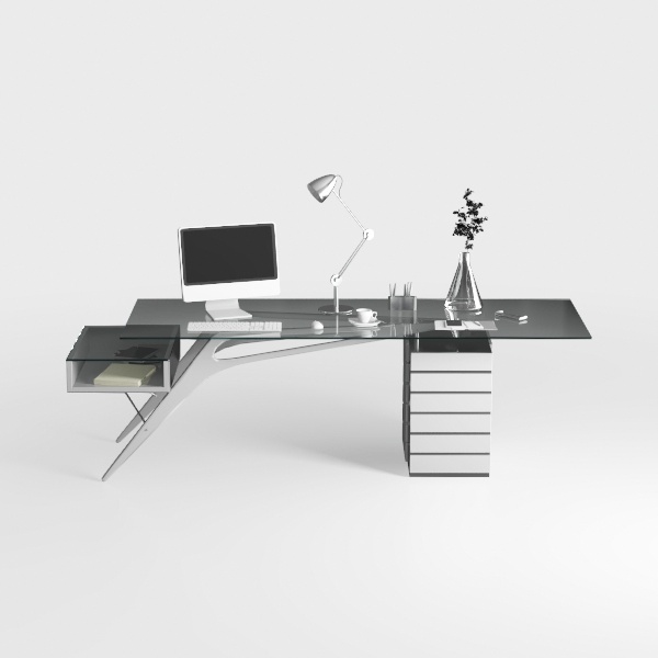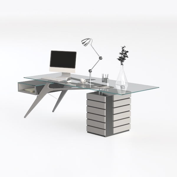 Crafted with geometric precision, this desk blends minimalist elegance and industrial edge. Its smooth, transparent glass top contrasts with sleek matte metal legs, offering a cool, tactile balance. Perfect for a modern workspace, it pairs beautifully with marble accents and soft lighting. Spacious side drawers provide hidden storage, while the angled frame adds subtle dynamism to the setup.
