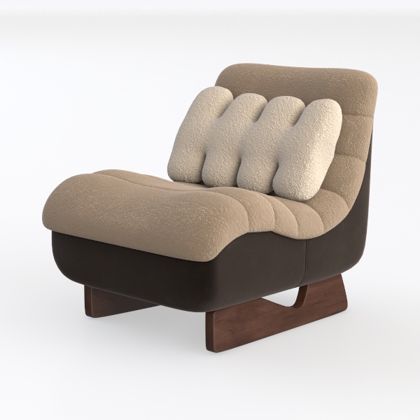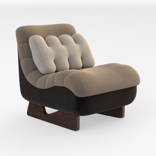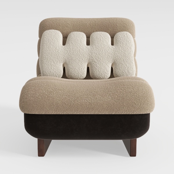 This armchair merges organic softness with modern simplicity, taking design cues from natural, flowing forms—like the gentle undulations of dunes or rippling water—translating that fluidity into its warm, sculptural shape. The upholstery, crafted from a plush bouclé texture, feels incredibly tactile: soft and slightly fuzzy to the touch, it wraps you in comfort, while the neutral beige of the seat and back, paired with a deep brown lower base, creates a serene, earthy palette that feels both timeless and fresh. Visually, the chair’s relaxed silhouette, with its gently curved edges and trio of wave-like pillows, adds softness without overwhelming the space, making it a versatile piece that balances style and coziness.