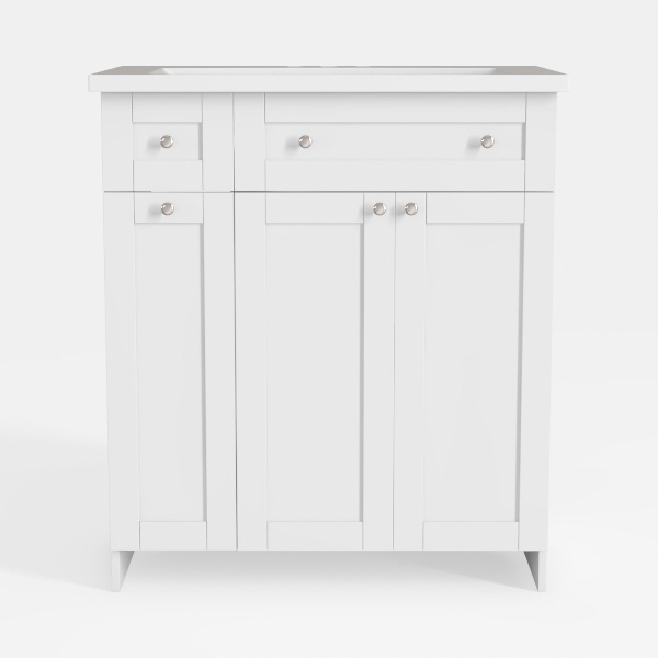 Inspired by classic Scandinavian minimalism, this piece features a smooth, matte white surface with subtle texture, complemented by sleek brushed nickel hardware. Its clean lines and balanced proportions create a serene, uncluttered look, cool to the touch. Ideal for modern, light-filled bathrooms, it pairs beautifully with marble countertops and soft warm lighting. Spacious drawers and double-door storage offer ample room for toiletries, while a sturdy, stable base ensures durability.