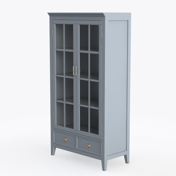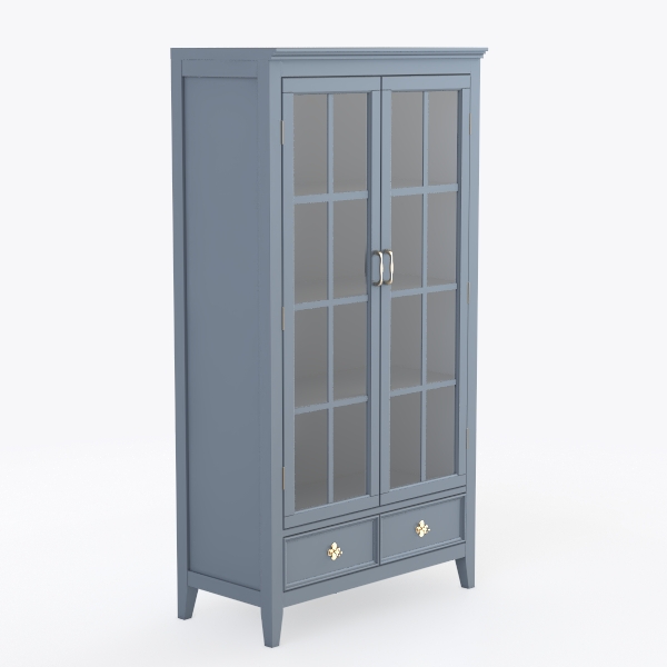 Design inspiration blends vintage charm with modern minimalism, echoing 19th-century country furniture elements with contemporary utility. Its soft blue finish, smooth to the touch, pairs with clear glass doors and gold metal handles, creating an elegant, lightweight visual. Ideal for modern-luxe living rooms or studies, complemented by wooden coffee tables and potted plants. Glass doors display decor, while lower drawers offer hidden storage, balancing style and practicality.