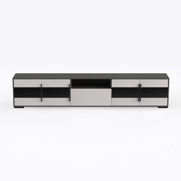 Inspired by urban minimalism, this piece merges geometric precision with a sleek black and white palette. Smooth matte surfaces and thin black metal handles create tactile contrast, while balanced layout ensures visual harmony. Ideal for modern living rooms, it pairs with gray sofas and marble accents, elevating space with understated elegance. Ample drawers and closed compartments offer hidden storage, with a central open shelf for TV or decor.