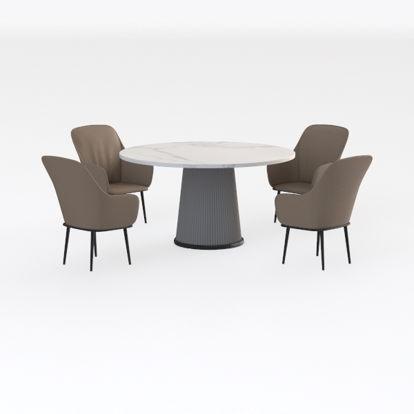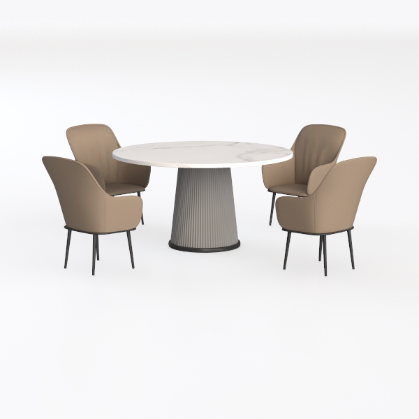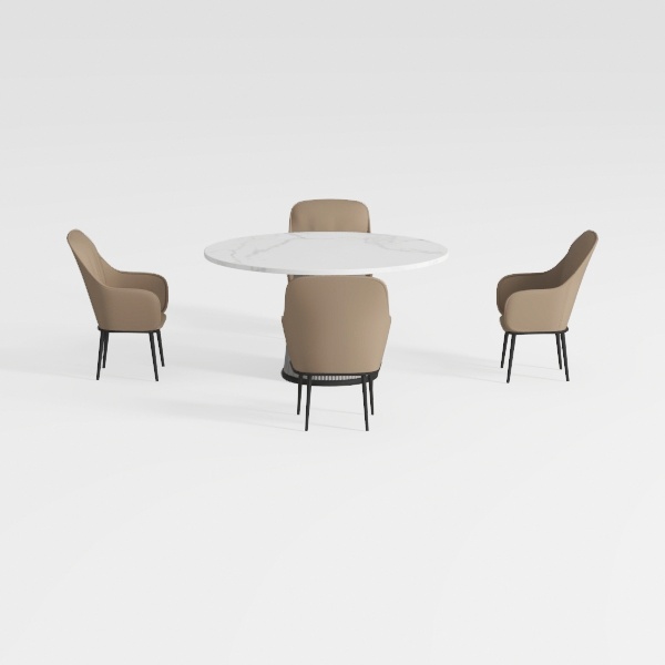 Designed by merging natural stone allure with minimalist precision, this set showcases a smooth, veined marble tabletop that radiates soft light, paired with warm beige upholstered chairs and sleek black legs. Ideal for modern or Scandinavian dining areas, it complements wooden sideboards and pendant lights, while the sturdy frame ensures both style and comfort for family meals.