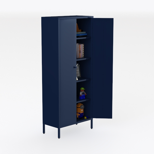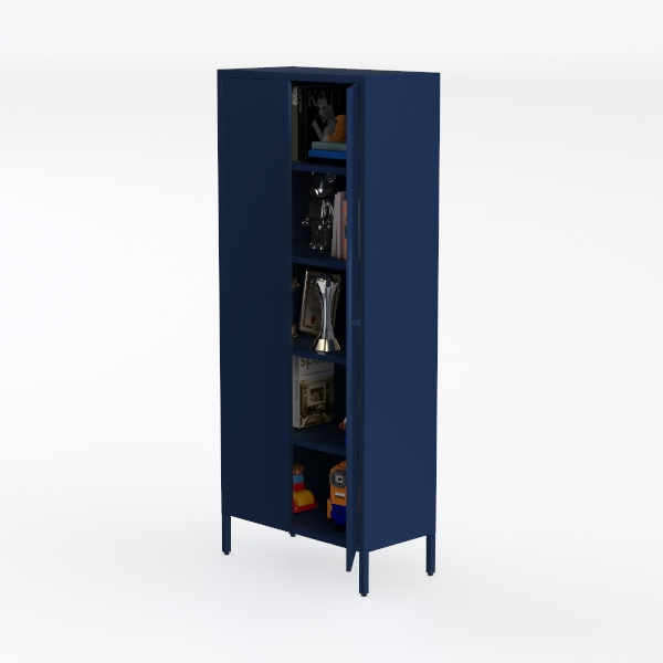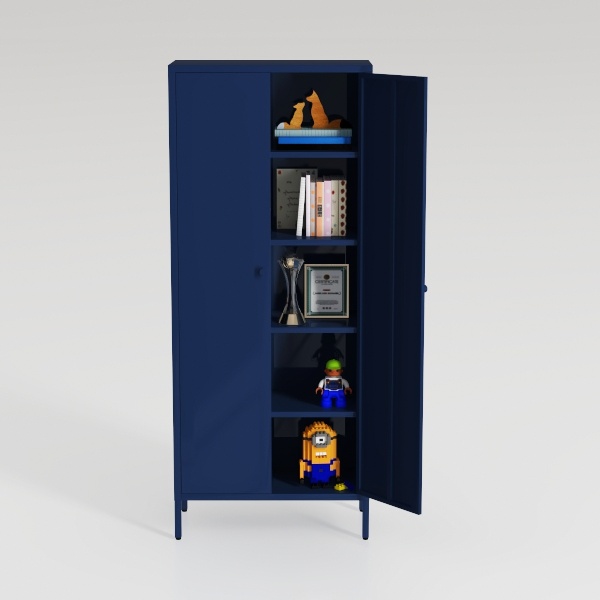 Inspired by merging practical storage with personal display, this navy cabinet with dual doors features clean lines and a sleek matte finish. Open shelves reveal books, trophies, a certificate, and playful decor like a Minion toy, blending sophistication and warmth. Ideal for modern or Scandinavian living rooms, it pairs with minimalist lighting and plants, offering ample space for daily essentials and cherished items.