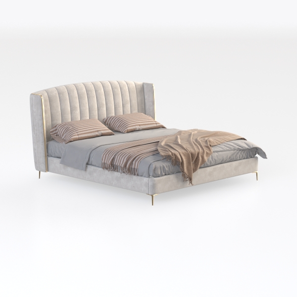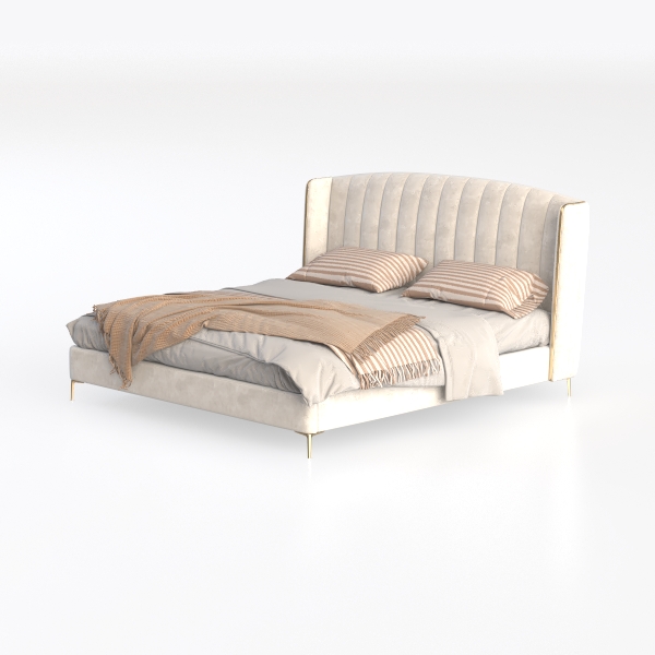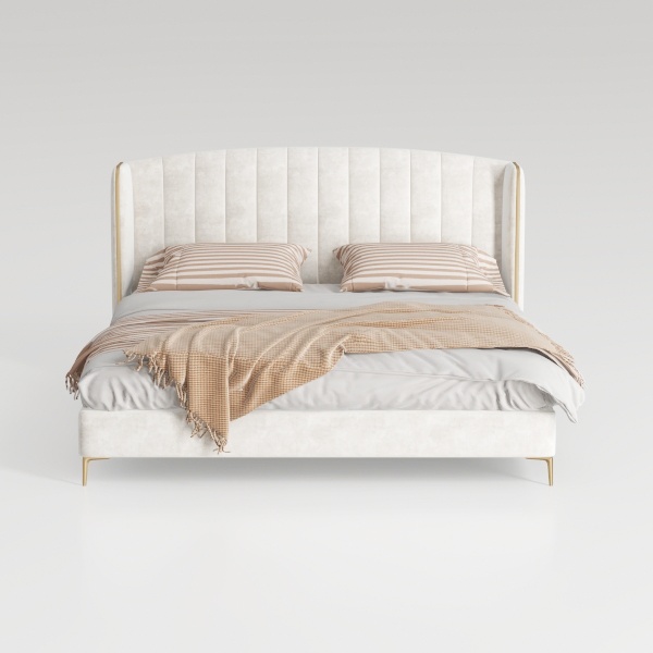 Inspired by soft, flowing natural forms, this bed blends organic curves with refined elegance. The plush, light upholstery and gently padded headboard create a tactile and visual softness, while slim gold legs add understated luxury. Ideal for modern minimalist or warm contemporary bedrooms, it pairs beautifully with wooden nightstands and warm-toned decor. The contoured headboard offers excellent back support, balancing style and comfort in restful moments.
