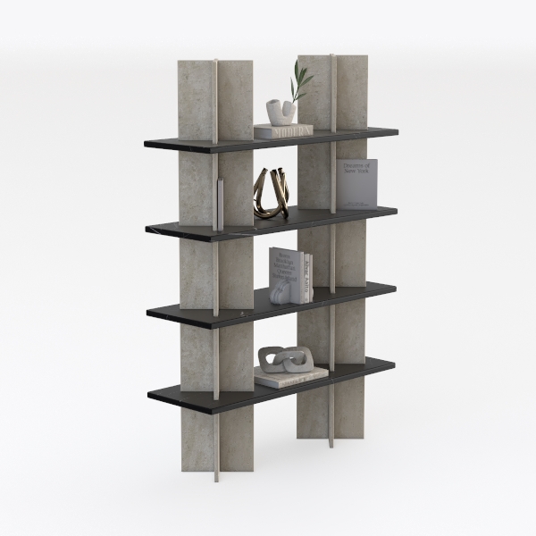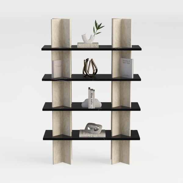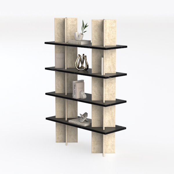 This shelving unit draws inspiration from geometric precision and minimalist architecture, balancing structure and style. Sleek black shelves contrast with warm, textured light stone supports, delivering a cool yet organic visual harmony. Clean lines and balanced proportions enhance any space. Ideal for modern, minimalist living rooms or home offices, it complements metallic accents and natural stone decor. Ample, divided shelves accommodate books, art, and small plants, blending storage and display functionality seamlessly.