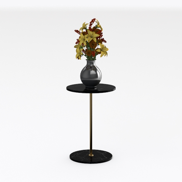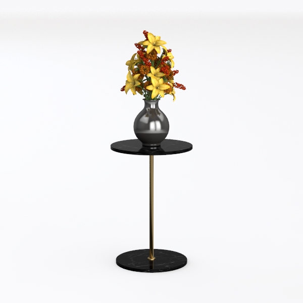 Started with a blend of natural simplicity and geometric precision, this piece features a smooth black marble surface that exudes cool elegance, paired with a golden metal base for warm contrast. A glossy gray vase holds vibrant yellow lilies and rich red berries, adding a pop of color to the clean lines. Perfect for modern, minimalist, or Scandinavian living rooms, it complements sofas and geometric art, with a two-tiered design offering decor space and a sturdy base ensuring stability.