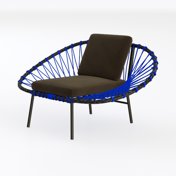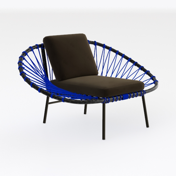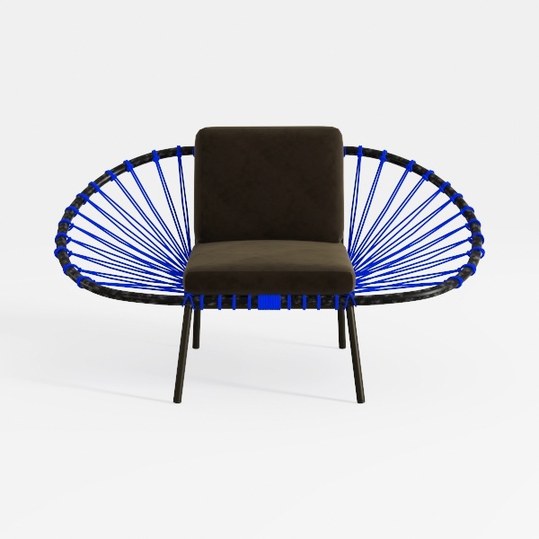 Inspired by organic radial patterns, this armchair blends soft velvet upholstery on seat and back with a sleek black frame and vibrant blue woven details. Creating a dynamic, airy visual, it’s ideal for modern minimalist or bohemian living rooms—pair with marble side tables and metallic floor lamps. Generous seat depth ensures cozy relaxation, while the flexible weave offers breathability and stability.