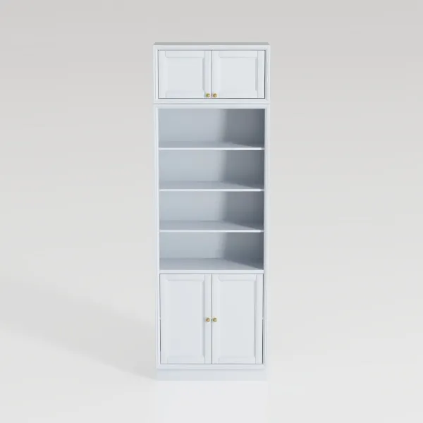 Crafted with a smooth, matte white finish, the surface feels cool yet inviting to the touch, while the crisp, rectangular silhouette—with straight edges and evenly spaced proportions—adds a sense of lightness. The subtle gold-toned hardware—small, round knobs on the double doors—introduces a touch of understated elegance, elevating the piece beyond basic functionality. The contrast between the closed, paneled top and bottom cabinets and the three open, slanted shelves balances structure and airiness, making it visually dynamic without overwhelming.