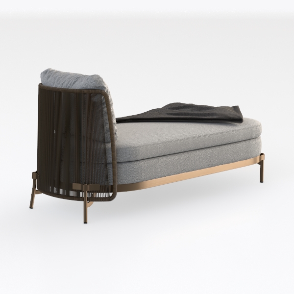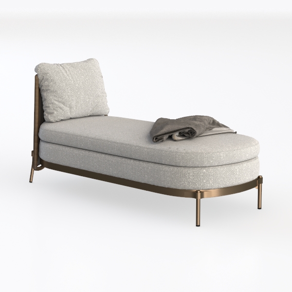 This elegant chaise lounge blends organic softness with geometric refinement, drawing design inspiration from the interplay of natural contours and modern minimalism. Its gentle, curved silhouette echoes the fluid lines of coastal landscapes, while the structured metal frame—crafted from brushed brass—adds a contemporary edge, balancing warmth and sharpness like light through a shell.