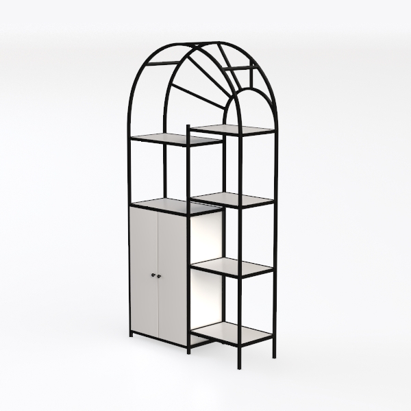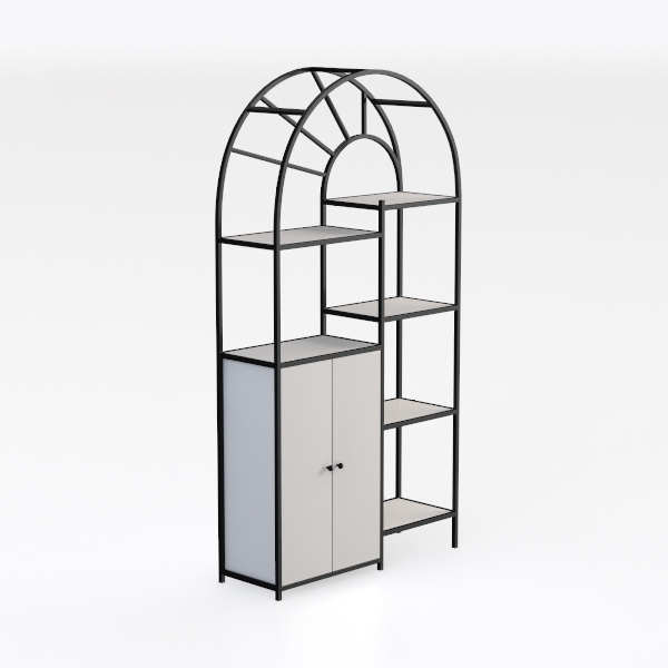 Inspired by architectural archways, this shelving unit blends classic curves with modern minimalism. Its black metal frame and white cabinet doors create a sleek, airy look, with glass-topped shelves offering open display space and closed storage below. Ideal for a contemporary living room or study, it pairs effortlessly with neutral decor, balancing functionality and timeless style.
