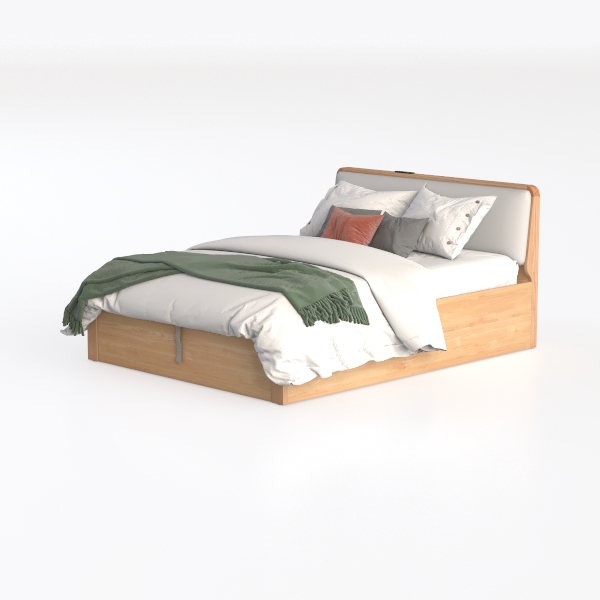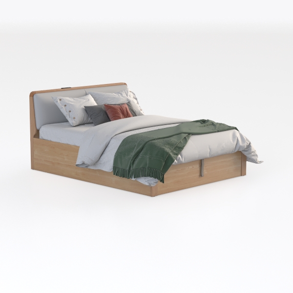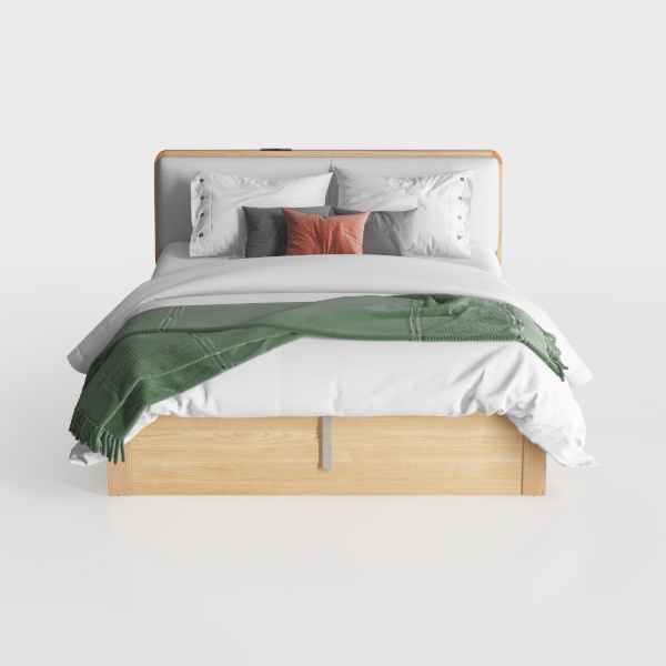 Designed with a blend of nature and minimalism, this piece draws inspiration from organic simplicity. The light oak bed frame radiates warmth, while the soft upholstered headboard adds gentle texture, inviting a cozy touch. Clean white linens and a muted green throw enhance its serene, airy vibe. Perfect for a modern Scandinavian bedroom, pair it with marble nightstands and potted succulents. A built-in under-bed drawer offers practical storage, balancing style with utility.