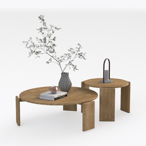 Inspired by organic forms and natural elements, this nested wooden table set showcases warm oak texture with smooth, soft surfaces, creating a cozy, earthy vibe. Perfect for modern minimalist or Scandinavian living rooms, pairing beautifully with marble accents and metallic lamp bases. The staggered round tables offer ample space for decor, books, and daily items, blending functionality and aesthetic charm seamlessly.