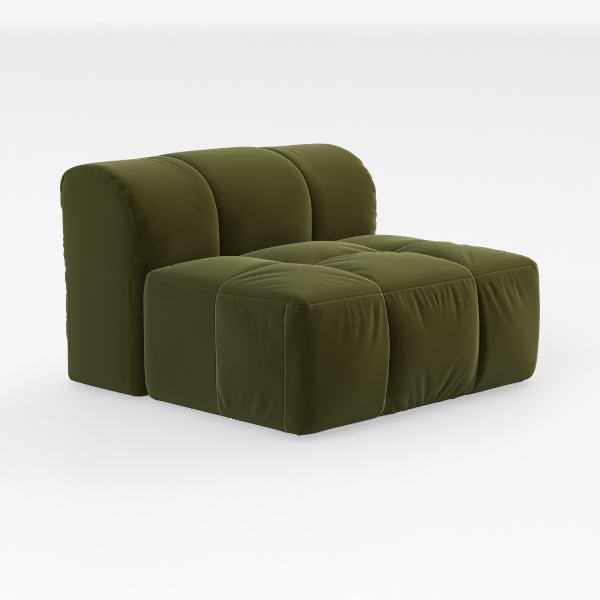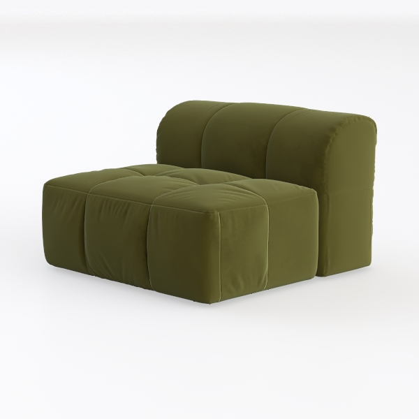 The olive-green, velvety upholstery is the star here—rich, plush, and deeply tactile, it wraps around a distinctive block-like structure where clean edges meet gently rounded corners. The fabric’s subtle sheen catches light softly, enhancing the hue’s warm depth, while the square, modular arrangement adds a modern twist, making it a focal point without overwhelming the space. It feels like a hug in furniture form, with every inch designed to cradle and comfort.