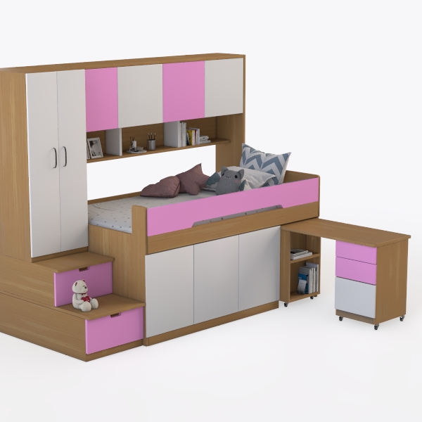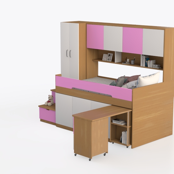 Designed to nurture a cozy, growing space, it blends playful charm with practicality, inspired by creating a versatile kids' retreat. Soft, warm pink, white, and wood tones create a gentle visual, with smooth surfaces and layered storage adding texture. Perfect for a modern kids' room, it pairs with soft rugs and cute decor. Integrated storage (wardrobe, drawers, bookshelf) and a compact desk offer ample space for sleep, study, and play.