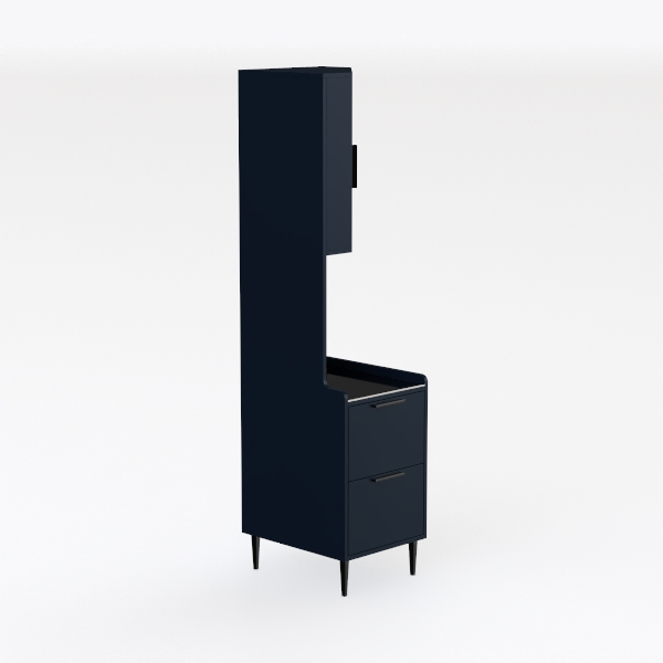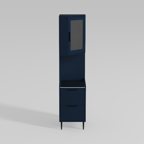 Inspired by contemporary minimalism, this tall storage unit merges practicality with style. Sleek matte navy finish offers a cool, smooth touch; glass-fronted top cabinet adds subtle transparency. Black slender legs balance solidity and lightness, elevating the piece. Ideal for modern living rooms or home offices, it pairs with marble accents and metallic lamps, with a central countertop and two deep drawers for organized storage.