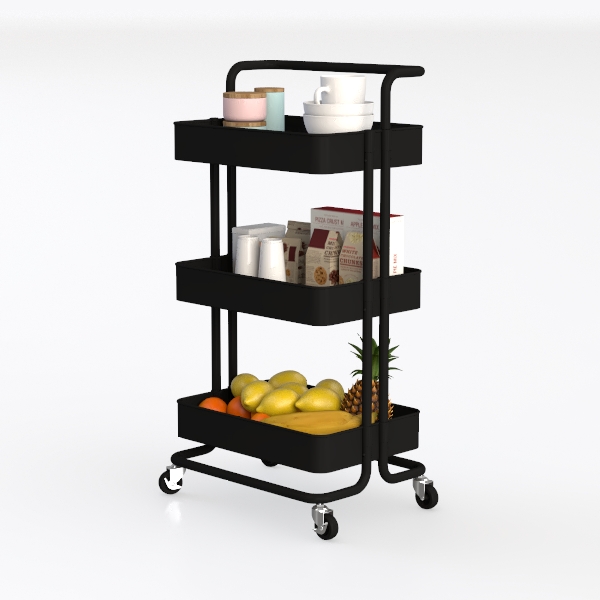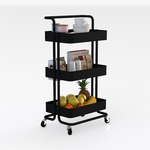 Designed for practical modern living, this sleek black cart blends functionality with minimalist style. Its matte black frame, smooth metal wheels, and clean lines create a durable, easy-to-clean surface, with three tiers offering ample space. Perfect for kitchens or living rooms, pairing seamlessly with modern, Scandinavian, or industrial decor. Wheels allow effortless mobility, holding fresh produce, kitchenware, or snacks—ideal for daily use and quick access.