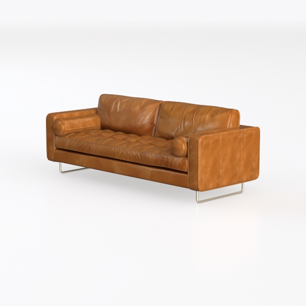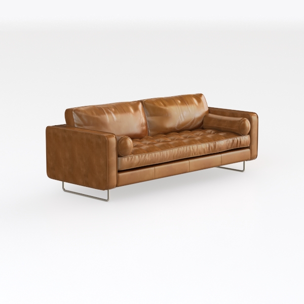 The leather’s texture is a highlight—surprisingly supple yet structured, soft to the touch but firm enough to cradle the body, with tufted detailing along the back and seat that adds subtle depth without overwhelming. It sits on slender, polished stainless steel legs, elevating the design to feel light and airy, while the low-profile frame maximizes space, making it ideal for both compact apartments and larger living rooms.