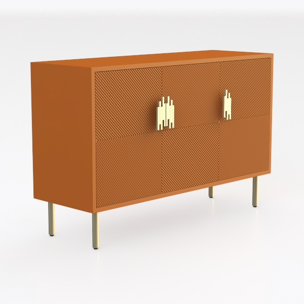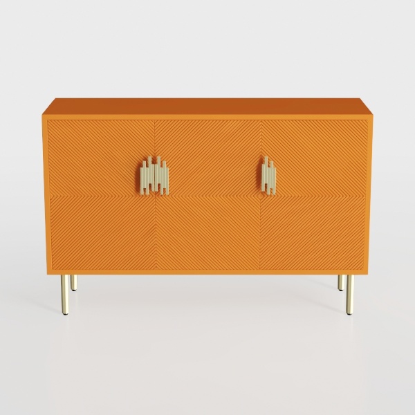 Inspired by mid-century modern design, this cabinet features a warm orange finish with intricate herringbone texture, exuding retro charm and contemporary elegance. Its smooth, tactile surface and geometric gold handles add sophistication, while slender gold legs elevate the look. A standout in modern minimalist living rooms, it pairs beautifully with neutral sofas and metallic accents, offering ample storage space for daily essentials.
