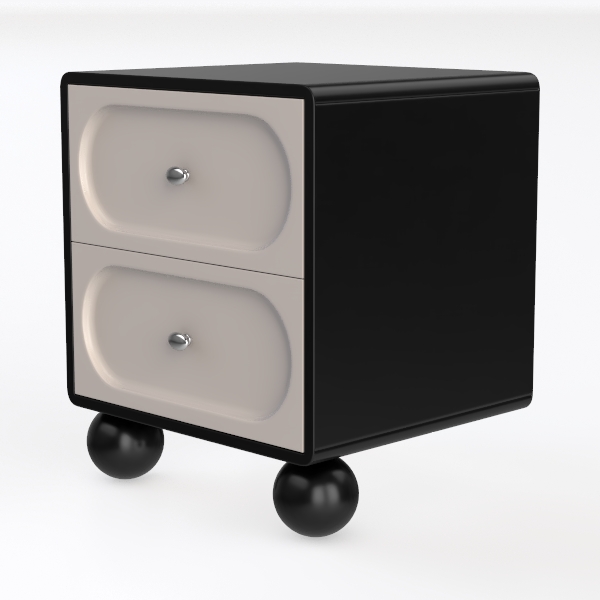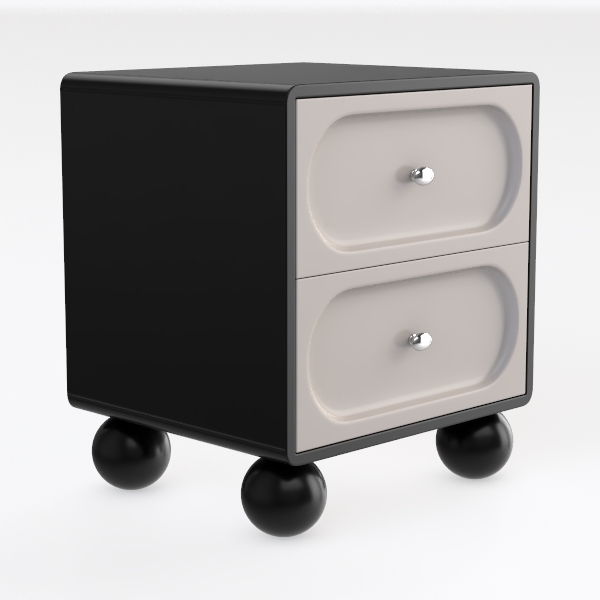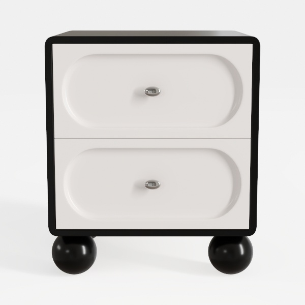 Inspired by mid-century modern design, this elegant nightstand blends retro charm with contemporary flair. Sleek white drawers, smooth to the touch, contrast striking black frames, while curved black spherical legs add playful sophistication. Ideal for modern minimalist or mid-century bedrooms, pairing with warm wood floors, brass desk lamps, and small potted plants. Two roomy drawers offer ample storage, gliding smoothly, with low legs keeping the space underneath accessible.