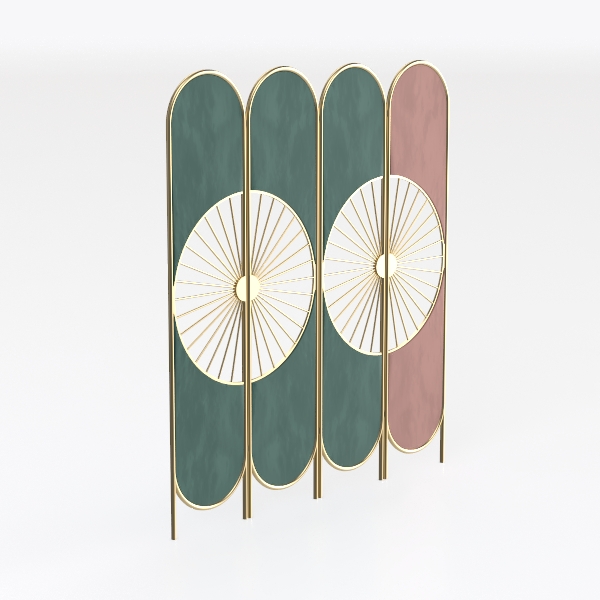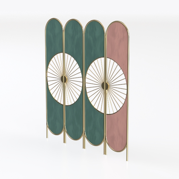 Designed with inspiration from traditional East Asian craftsmanship, this room divider blends intricate fan-shaped patterns. Its velvety green and soft pink panels, paired with a gleaming gold frame, offer a blend of soft touch and elegant visual appeal. Lightweight and flexible, it divides spaces while adding a decorative focal point, ideal for modern Chinese or minimalist living rooms when paired with marble surfaces and metallic accents.