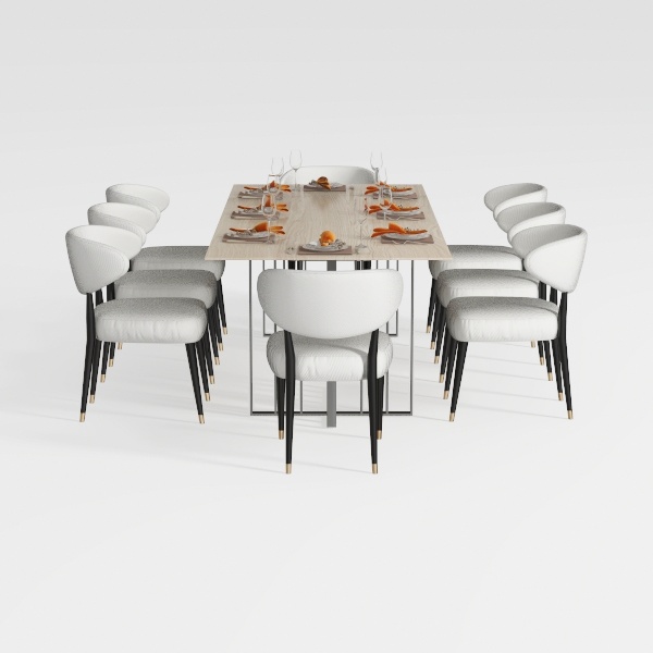 Inspired by a blend of modern minimalism and refined elegance, this dining set features a smooth wooden tabletop, soft white upholstered chairs with grey cushions, and sleek black metal legs accented with gold, creating a clean yet inviting atmosphere. Perfect for a modern-luxury dining room, it pairs beautifully with marble decor and warm ambient lighting. The deep, padded seats provide exceptional comfort, while the spacious tabletop easily accommodates family meals or entertaining guests.