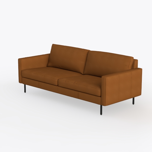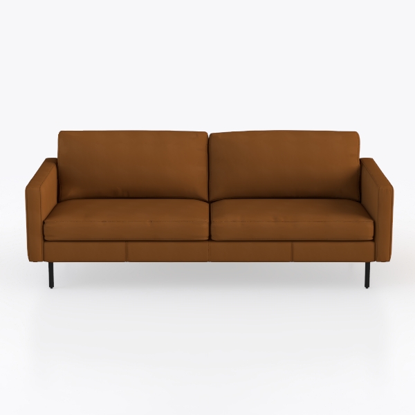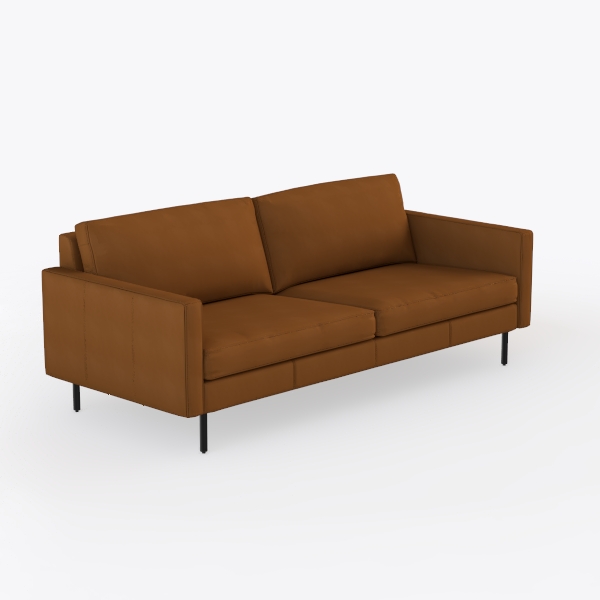 The upholstery, a rich, sunlit caramel hue, feels surprisingly tactile: smooth yet plush, with a subtle luster that softens the light, making the space feel warm and inviting. Its silhouette is streamlined, with gently sloped armrests and a low, wide frame that exudes stability without bulk, while the tight back cushions maintain a crisp, tailored look that complements both small apartments and larger living rooms.