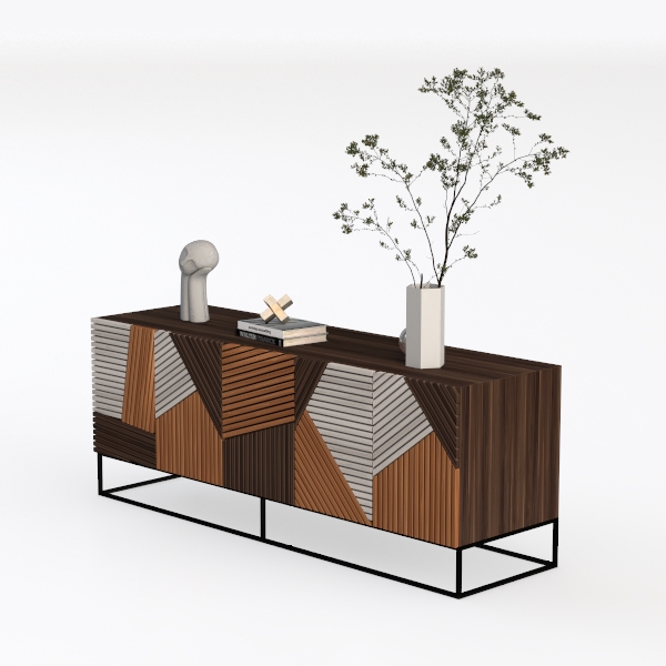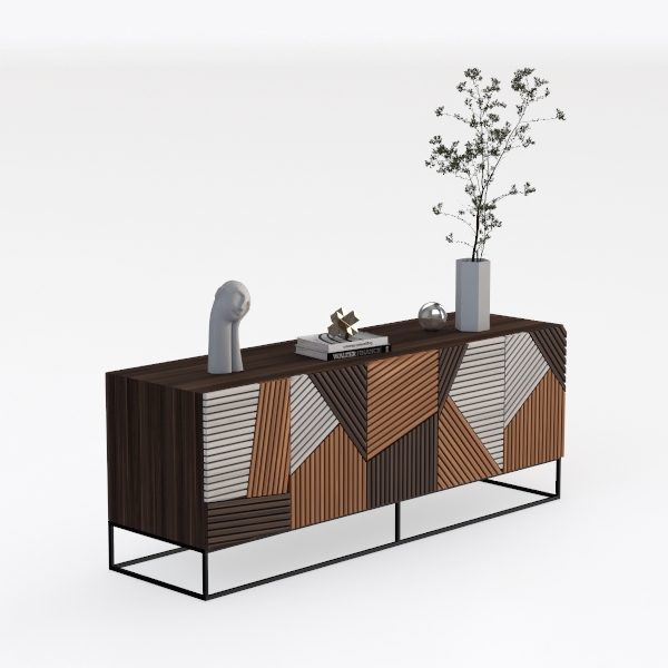 Inspired by architectural geometry, this cabinet blends warm, smooth wood textures with bold geometric patterns of brown, white, and black, creating layered visual appeal. Ideal for a minimalist living room, it pairs beautifully with marble coasters or metallic lamp bases, enhancing modern elegance. Spacious storage with lightweight metal legs adds both practicality and a sleek, uncluttered look, perfect for organizing daily essentials.