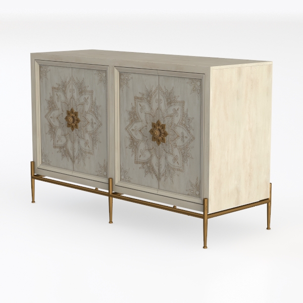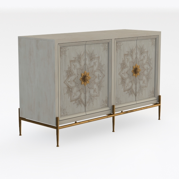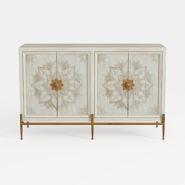 Crafted from weathered wood with intricate golden floral carvings, this cabinet draws inspiration from vintage Eastern patterns. Its soft white surface feels warm and textural, while gold metal legs add opulence. Ideal for a modern bohemian or classic luxury living room, pair with marble accents and velvet sofas. Ample storage space with smooth closures blends style and functionality seamlessly.