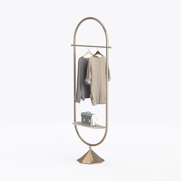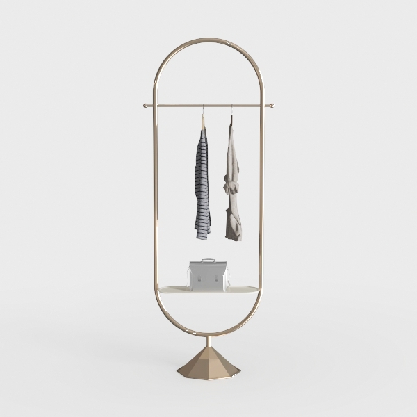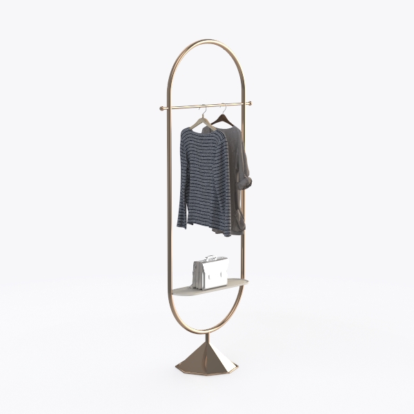Inspired by minimalist geometry, this elegant garment rack blends sleek metalwork with functional design. Its smooth, polished frame shimmers softly, while the conical base adds subtle stability. Perfect for modern, minimalist spaces—ideal for a living room corner or bedroom entryway, pairing beautifully with neutral-toned furniture. A top bar holds coats, a lower shelf stores bags, balancing style and practicality seamlessly.
