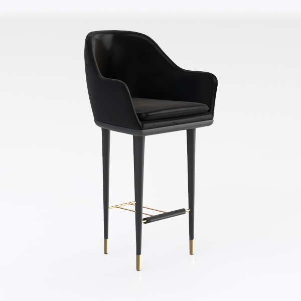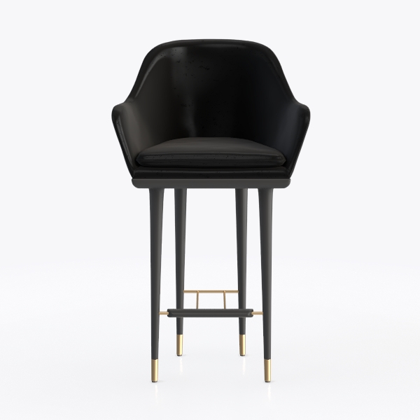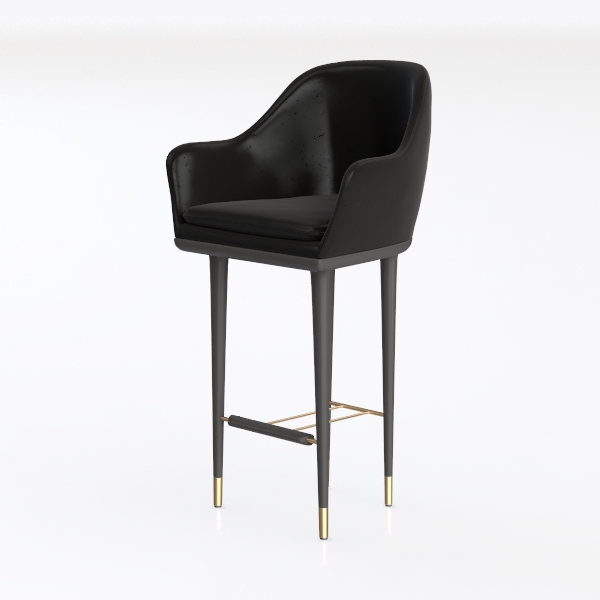 Inspired by mid-century modern design, its clean silhouette blends geometric precision and soft curves. Smooth black leather upholstery offers a cool, tactile contrast to sleek, slender black legs, while brushed gold accents on the footrest and leg tips add warm luxury. Ideal for a modern minimalist kitchen island or contemporary bar, it pairs beautifully with marble surfaces and matte black bar carts. Ergonomic armrests and a sturdy metal frame ensure comfort during long use, balancing function and statement.