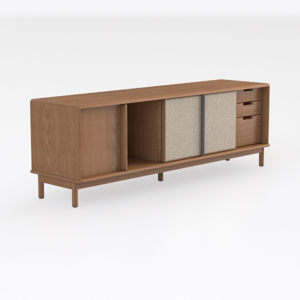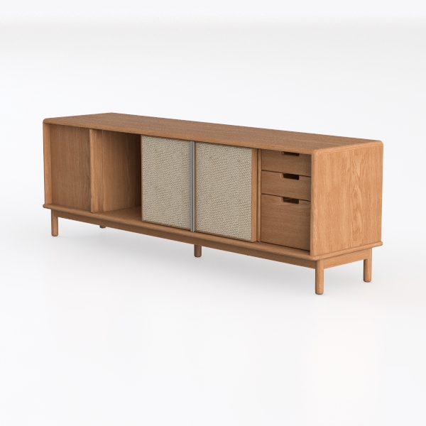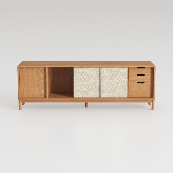 Designed with Scandinavian minimalism, this cabinet draws inspiration from nature, blending warm oak wood with visible grain—tactile, organic—paired with textured woven doors for soft contrast. Clean lines and light, airy presence blend elegance and function, ideal for modern living or study rooms. Pair with neutral sofas and marble accents; spacious drawers and open shelves offer ample storage, balancing style and practicality.