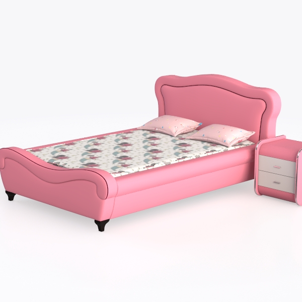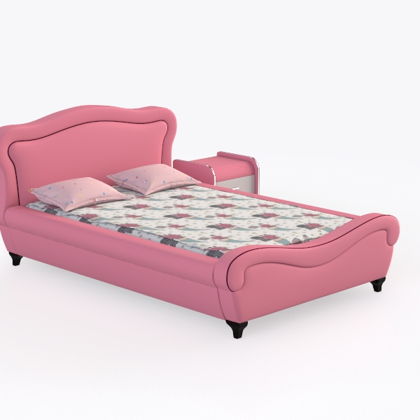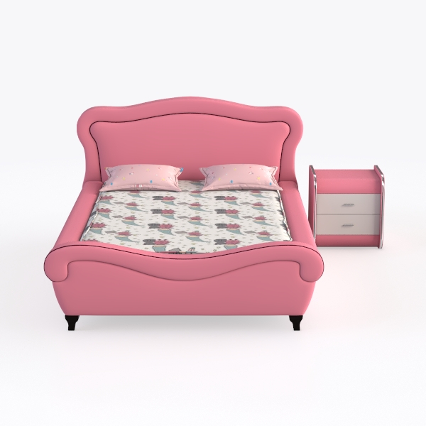 Inspired by soft, warm childhood dreams, this bed features a curvy pink frame with a plush, velvety texture that feels gentle to the touch. The floral-patterned bedspread and dotted pillows add a sweet, playful vibe, while the matching pink-and-white nightstand with two drawers offers handy storage. Ideal for a cozy, girlish bedroom, it blends comfort and charm seamlessly.