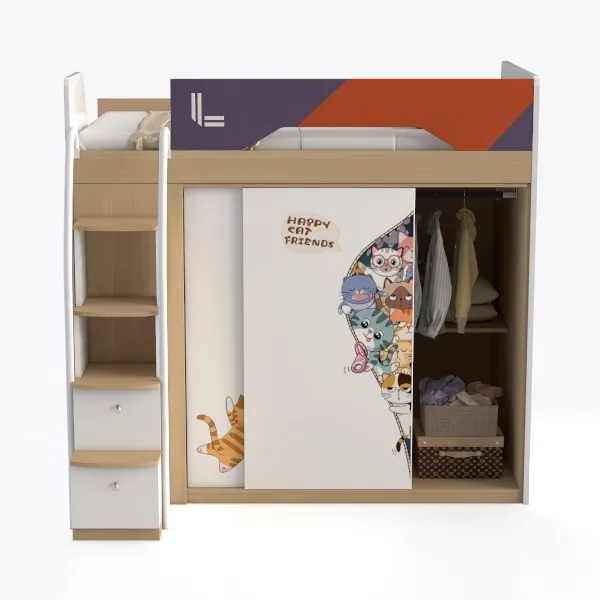 Designed to blend playful charm with practicality, this piece takes inspiration from children’s love for cute elements and organized spaces. Smooth surfaces and soft, warm tones create a cozy vibe, while vibrant cat illustrations on the wardrobe doors add a lively touch. Ideal for a kid’s room, it pairs with playful decor, enhancing a modern-cute aesthetic. The loft bed saves space, with built-in drawers and a closet for ample storage, making it both functional and fun.