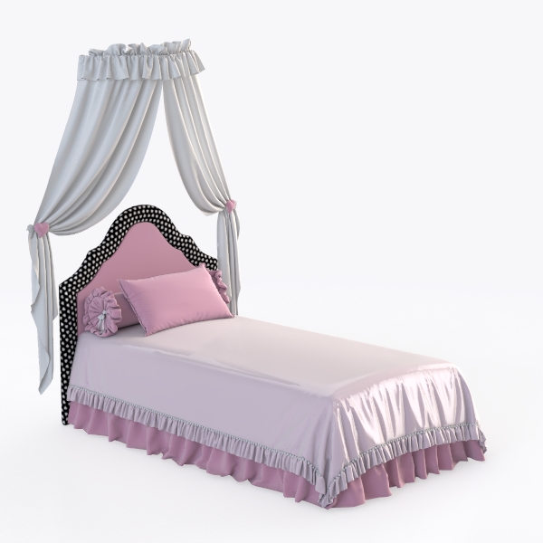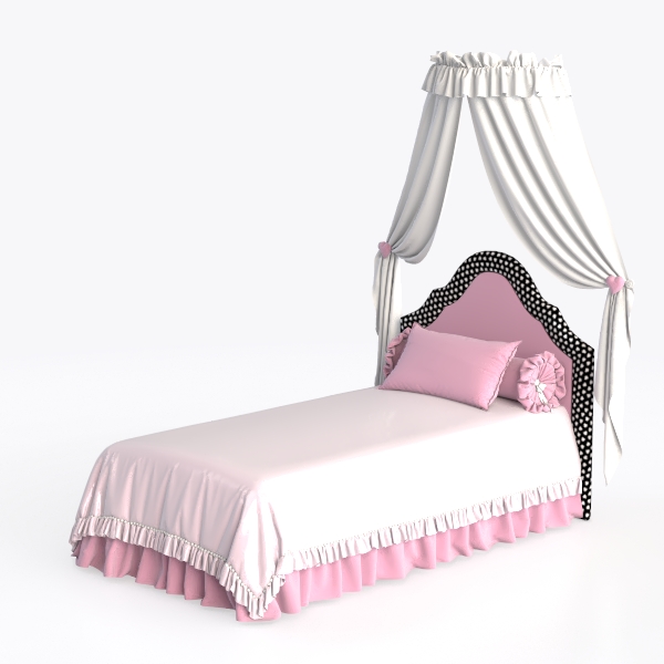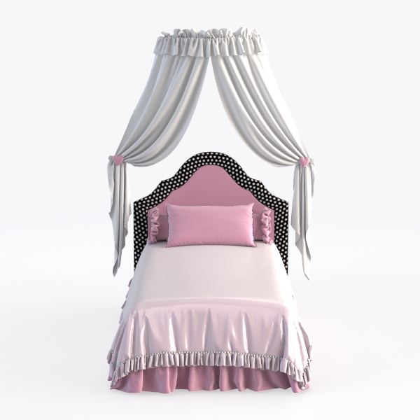 Inspired by romantic vintage charm, this bed blends soft pastels with playful polka dots. The white, flowing canopy adds dreamy softness, while pink linens feel smooth and cozy. Pair with wooden furniture and lace accents for a girl’s room or vintage bedroom. Curved headboard offers gentle support, and ruffled bedskirt enhances the elegant, relaxed vibe, perfect for unwinding.