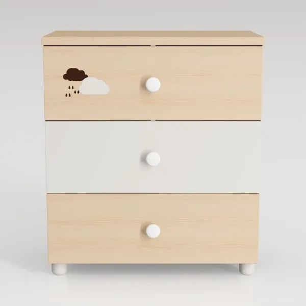 This piece takes design cues from the gentle charm of a misty morning, with soft raindrop and cloud motifs that infuse a touch of whimsy. Crafted with warm, natural wood grain on its three drawers, the light beige hue creates a calm, earthy foundation, while crisp white drawer fronts offer a clean, modern contrast. Visually, the combination feels soft and inviting, with the wood’s subtle texture adding depth and the white accents keeping the look bright and uncluttered. The tactile experience is equally pleasant—wooden surfaces are smooth and slightly cool to the touch, while the white fronts maintain a smooth, matte finish, balancing warmth and freshness.